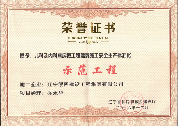 兒科及內(nèi)科病房標(biāo)準(zhǔn)化工程榮譽(yù)證書(shū)