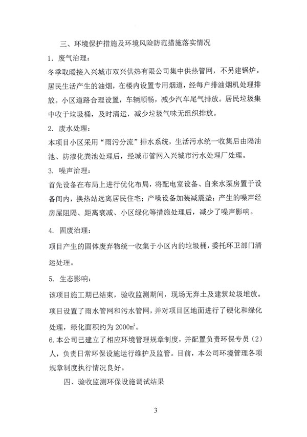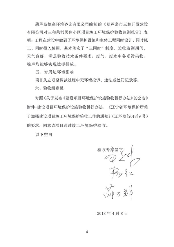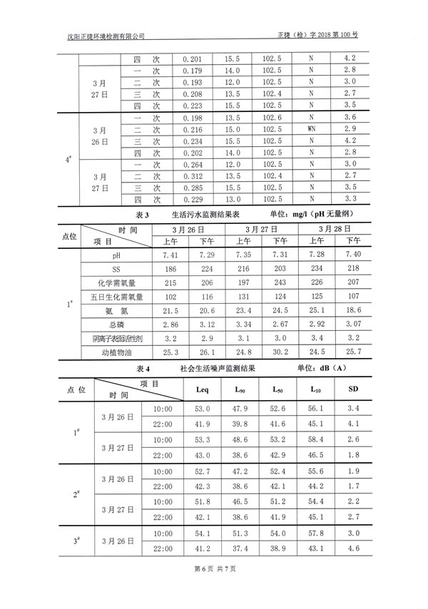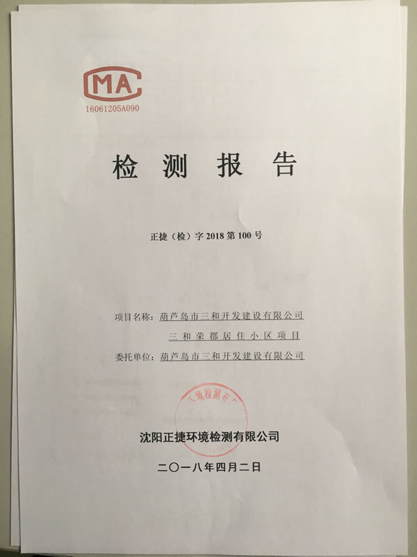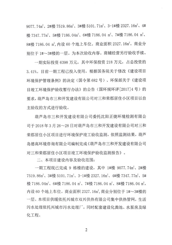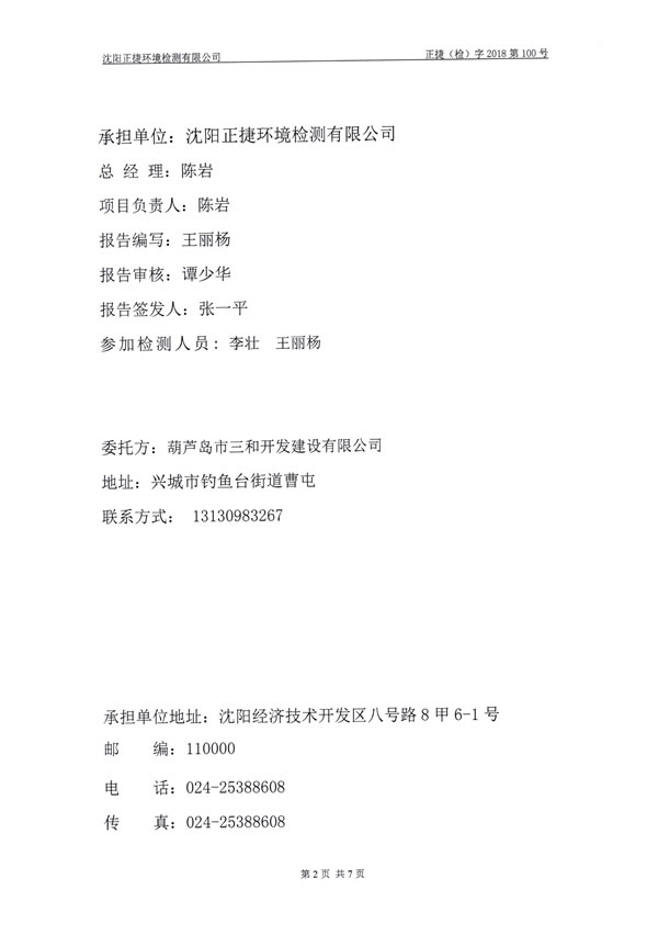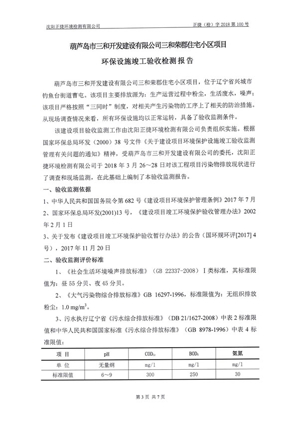 。14)沈陽正捷環(huán)境檢測有限公司《葫蘆島市三和開發(fā)建設(shè)有限公司三和榮郡居住小區(qū)項目環(huán)保設(shè)施竣工驗收檢測報告》,2018年4月2日。