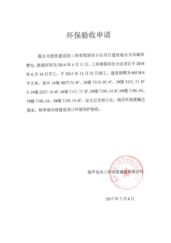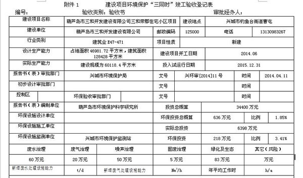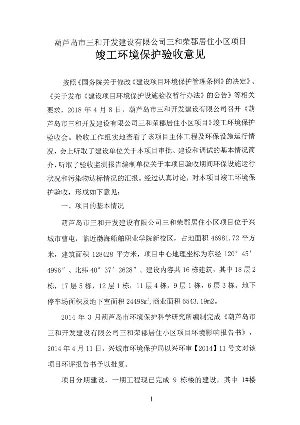 該項目根據(jù)《中華人民共和國環(huán)境保護法》和《建設(shè)項目環(huán)境保護管理辦法》的規(guī)定進行了環(huán)境影響評價。 2014年3月葫蘆島市環(huán)境保護科學(xué)研究所編制完成《葫蘆島市三和開發(fā)建設(shè)有限公司三和榮郡居住小區(qū)項目環(huán)境影響報告表》,2014年4月11日興城市環(huán)境保護局以興環(huán)審【2014】11號文給與《關(guān)于葫蘆島市三和開發(fā)建設(shè)有限公司三和榮郡居住小區(qū)項目環(huán)境影響報告表的批復(fù)》,該項目環(huán)境保護檔案資料齊全。