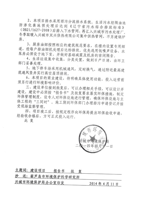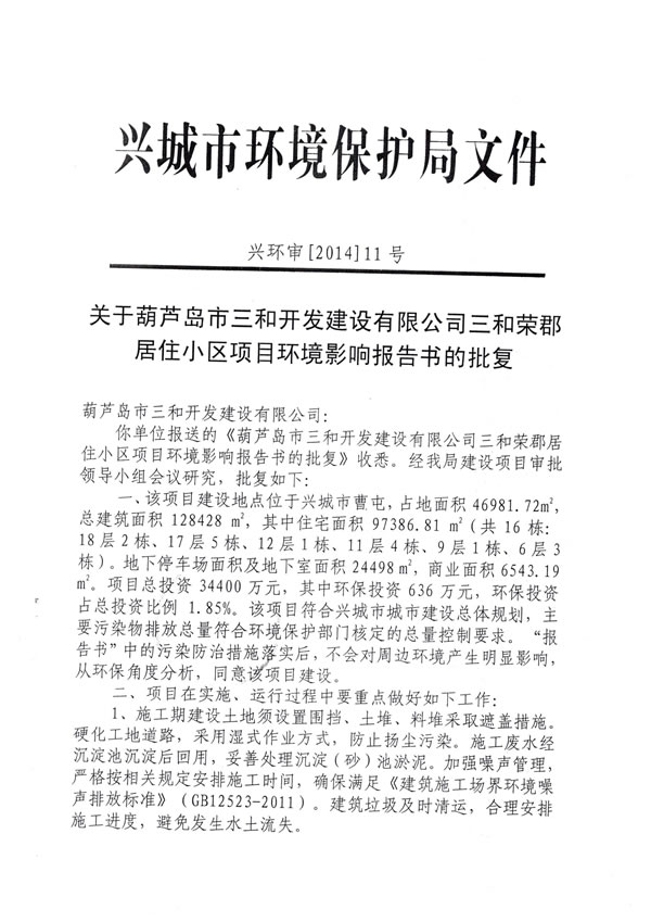 。13)興城市環(huán)境保護局 興環(huán)審【2014】11號文《關(guān)于葫蘆島市三和開發(fā)建設(shè)有限公司三和榮郡居住小區(qū)項目環(huán)境影響報告表的批復(fù)》,2014年4月11日;