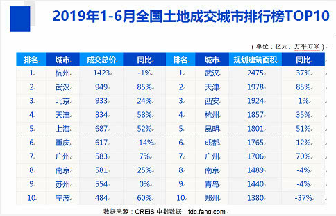 中指研究院發(fā)布的《2019年上半年全國房地產(chǎn)企業(yè)拿地排行榜》顯示,上半年全國土地成交金額TOP10城市(杭州、武漢、北京、天津、上海、重慶、廣州、南京、蘇州、寧波)累計成交7645億元,同比增長16%;規(guī)劃建筑面積TOP10城市成交17815萬平方米,同比增長9%。