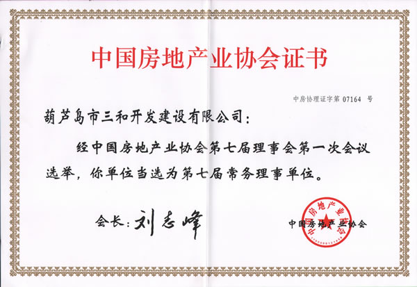 2014年5月13日中國房地產(chǎn)協(xié)會第七次會員代表大會在北京召開,葫蘆島市三和開發(fā)建設(shè)有限公司當(dāng)選為中國房地產(chǎn)協(xié)會第七屆常務(wù)理事單位。