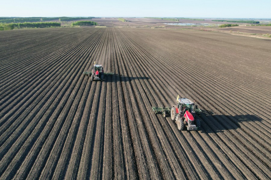 2025年5月23日,在北大荒集團(tuán)黑龍江建設(shè)農(nóng)場(chǎng)有限公司第三管理區(qū),農(nóng)機(jī)工人駕駛搭載北斗衛(wèi)星導(dǎo)航自動(dòng)系統(tǒng)的大型中耕深松機(jī)械,對(duì)剛出苗的玉米地塊進(jìn)行深松放寒作業(yè)(無(wú)人機(jī)照片)。新華社發(fā)(許穎獻(xiàn)攝)