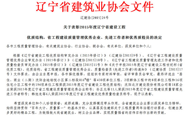 根據(jù)《遼寧省建設(shè)工程優(yōu)質(zhì)結(jié)構(gòu)審定辦法(2015年修訂)》(遼建協(xié)[2015]9號(hào))、《遼寧省工程建設(shè)質(zhì)量管理優(yōu)秀企業(yè)審定辦法(2015年修訂)》(遼建協(xié)[2015]10號(hào))文件精神,由企業(yè)自愿申報(bào),市擇優(yōu)推薦審核,省評(píng)審委員會(huì)審定,遼寧綏四建設(shè)工程集團(tuán)榮獲以下榮譽(yù)和獎(jiǎng)項(xiàng): 。ㄒ唬┻|寧綏四建設(shè)工程集團(tuán)有限公司被評(píng)為2015年度遼寧省工程建設(shè)質(zhì)量管理優(yōu)秀企業(yè)。 。ǘ┘瘓F(tuán)榮獲省優(yōu)質(zhì)主體結(jié)構(gòu)獎(jiǎng)項(xiàng)工程: 1、綏中縣全民健身活動(dòng)中心; 2、葫蘆島市龍港區(qū)兩河三村回遷樓改造二期一標(biāo)段1#樓; 3、葫蘆島市龍港區(qū)兩河三村回遷樓改造二期一標(biāo)段2#樓; 4、葫蘆島三和榮郡1#住宅樓; 5、葫蘆島三和榮郡2#住宅樓; 6、葫蘆島三和榮郡3#住宅樓; 7、葫蘆島三和榮郡4#住宅樓; 8、葫蘆島三和榮郡5#住宅樓; 9、葫蘆島三和榮郡6#住宅樓; 10、葫蘆島三和榮郡7#住宅樓; 11、葫蘆島三和榮郡8#住宅樓; 我集團(tuán)將繼續(xù)認(rèn)真落實(shí)住建部關(guān)于工程質(zhì)量兩年治理行動(dòng)要求,創(chuàng)建出更多更好的精品工程,樹立企業(yè)品牌,為做強(qiáng)做大遼寧省建筑業(yè)的宏偉目標(biāo)作出新的貢獻(xiàn)。