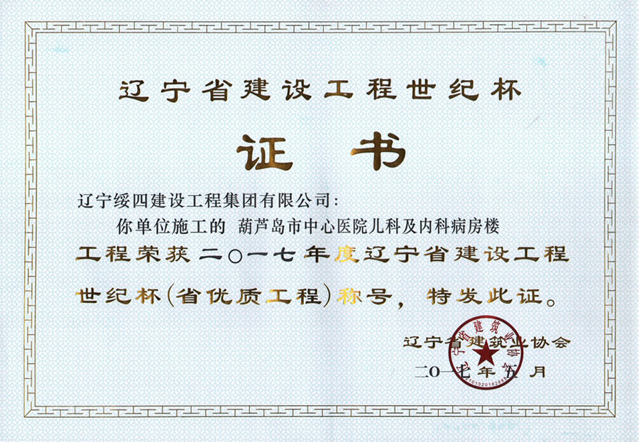 “葫蘆島市中心醫(yī)院兒科及內(nèi)科病房樓”榮獲2017年度遼寧省建設(shè)工程世紀(jì)杯稱(chēng)號(hào)
