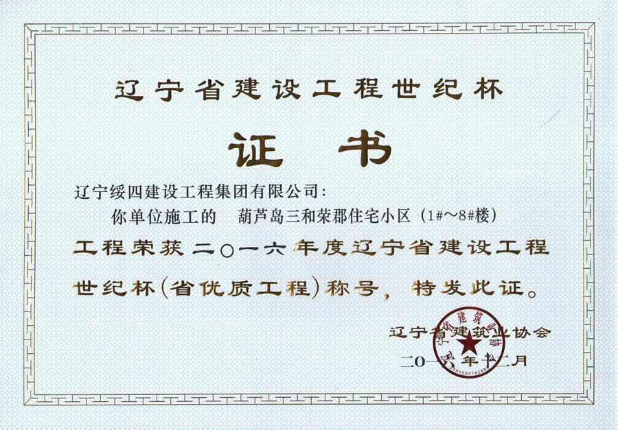 “葫蘆島三和榮郡住宅小區(qū)1-8#樓”榮獲2016年度遼寧省建設(shè)工程世紀杯稱號