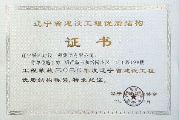 “葫蘆島三和恬園小區(qū)二期工程19#樓”榮獲2020年度遼寧省建設工程優(yōu)質(zhì)結(jié)構(gòu)稱號