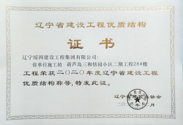 “葫蘆島三和恬園小區(qū)二期工程28#樓”榮獲2020年度遼寧省建設(shè)工程優(yōu)質(zhì)結(jié)構(gòu)稱號