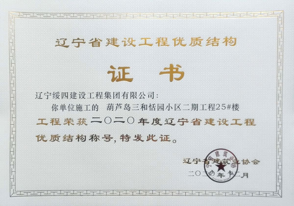 “葫蘆島三和恬園小區(qū)二期工程25#樓”榮獲2020年度遼寧省建設(shè)工程優(yōu)質(zhì)結(jié)構(gòu)稱號