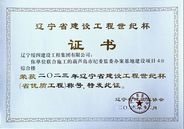 | 葫蘆島市紀(jì)委監(jiān)委辦案基地建設(shè)項(xiàng)目4#綜合樓 榮獲2023年遼寧省建設(shè)工程世紀(jì)杯(省優(yōu)質(zhì)工程)稱號(hào) |
